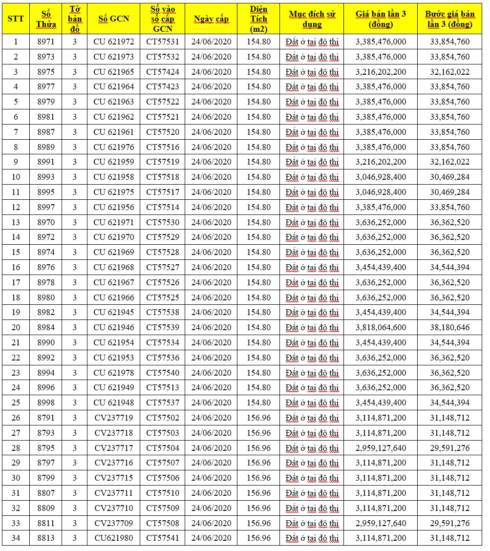 1. Tài sản bán đấu giá: 40 quyền sử dụng đất tọa lạc tại phường 6, thành phố Tân An, tỉnh Long An (nay là phường Long An, tỉnh Tây Ninh) theo các giấy chứng nhận quyền sử dụng đất, quyền sở hữu nhà ở và tài sản khác gắn liền với đất do Sở tài nguyên và môi trường tỉnh Long An cấp, hiện trạng tài sản là đất trống (không có tài sản trên đất).
